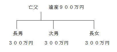 たとえば、父が亡くなり、その時点で父の遺産は900万円だったとしましょう。相続人が長男・次男・長女の3人です。そうすると、本来は、下の図のように、法定相続割合は300万円ずつとなります。