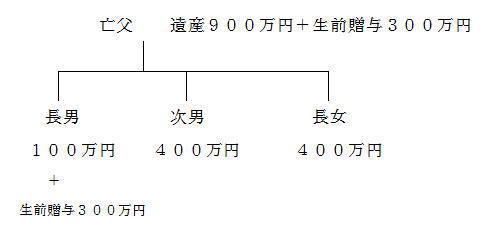 まず、相続割合の計算上、現実にある遺産額900万円に、生前贈与の300万円を足して、遺産額を出し、そこから法定相続割合を計算します(「持ち戻し」と言います)。1200万円の3等分ですので、それぞれ400万円となります。